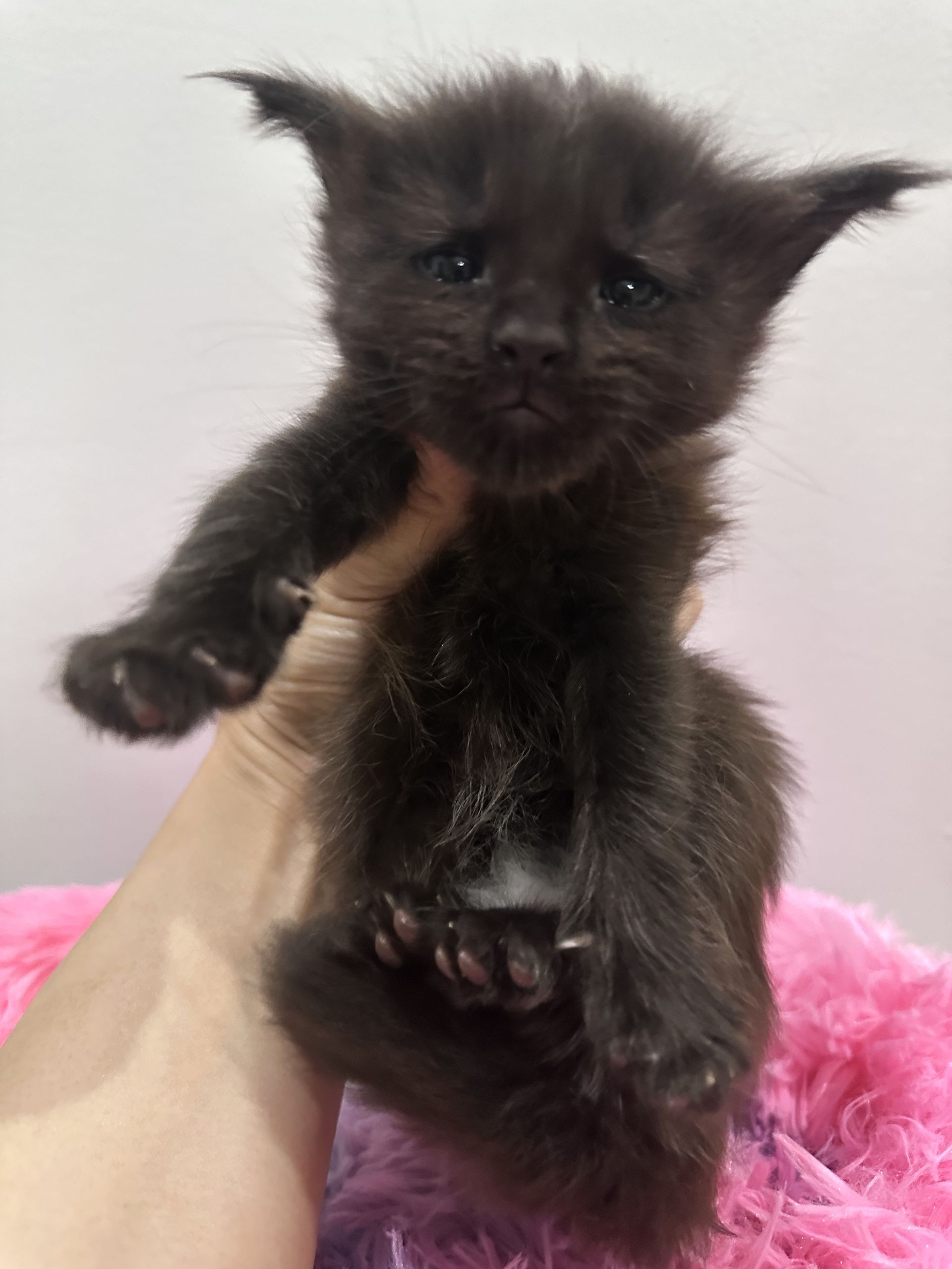 Reserved for Joseph "Ami"-Solid black female with a tuft of white of fur on the lower belly. She will have gold eyes as an adult. Her parents are Coral Gemstone and Banksy. Born 2/7/26.